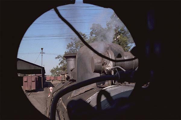 Despite the diesels' arrival steam repairs were continuing. G 731 was acting as pilot and it manoeuvred F 716 (looking superb after overhaul and repaint), with F 712 ready for overhaul. Two other engines were being steamed after light repairs, they were G 730 and F 717. Anxious to offload my crowd of gawkers I accepted an offer from the crew of the pilot to join them on the footplate. I sat on the fireman’s seat and quickly learnt to dodge the oil drip from the lubricator, which was spluttering away. I could see over the boiler from my seat, the F class was a small locomotive. The driver was taking it easy, leaning back on the tender, whilst the fireman was driving. The odd shovel of coal was thrown through the low door and into the firebox as we trundled around the yard parallel to the bg. This was the view from the cab of F 715 as it shunts the yard area.