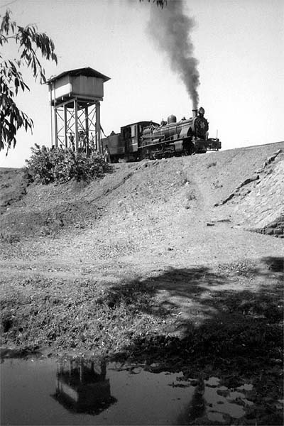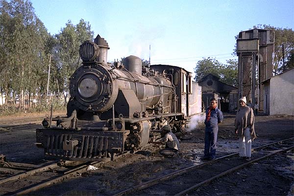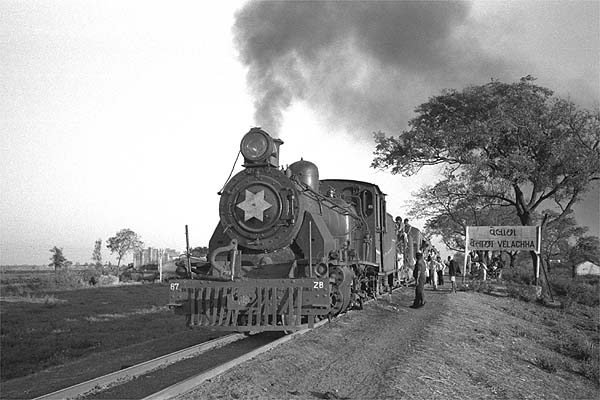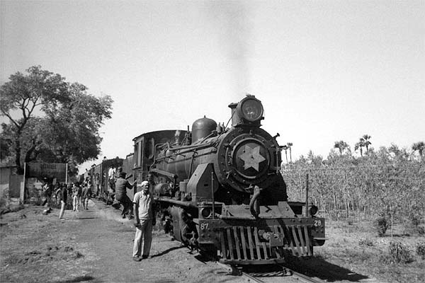 After a visit to the Bilimora to Waghai system, I returned on 25th January 1989. The narrow gauge train was shown in the timetable as departing at 09.30, but had been locally re-timed to 10.00. Departure was 40 minutes late which, if maintained, would have meant that I would miss the last local train back to Surat. Later trains were all overnight expresses, meaning I would have to join the usually overloaded un-reserved carriage. The crew assured me that they would be back close to time, it sounded like wishful thinking! After the initial climb out of the station, the engine settled down to a quickly paced run across the flat landscape. The locomotive was pleasant to ride, looked easy to fire and chewed up the kilometres with gusto. I was surprised at the number of signals along the line; these were controlled by the numerous crossing keepers. The regulator was designed for use by either the driver or fireman. For the first time in a cab I saw this in operation as the fireman was better placed to see the crossing signals we charged toward them with no reduction in speed but with the whistle blowing, it seemed to do the trick! Despite some fast running I noticed we had dropped a little time. Some of this was at prolonged station stops for tea giving station staff time to chat, the line being well out of sight of officialdom. The fireman told me the driver was unhappy with the engine, it would not reach the point where the safety valves lifted and the valves settings were out, he and the driver had reached the last conclusion by listening to the beat from the chimney which they tried to demonstrate to me. They both spent time out on the running plate, not easy on badly laid lines where the engine bucked and rolled, they were trying to diagnose a fault with the valve gear (or grandstand for me)? They claimed repairs were often not carried out properly and that the shed master accepted poor quality coal, the fire did clinker quickly and needed to be cleaned out at several station stops en route. On the run the firing irons were brought into play, after the fire was given a vigorous stir the pressure dropped and then rapidly rose: replacing the red hot iron to the tender was quite unnerving in the small cab. The crew supplemented their pay by charging for rides on the water gin. Coal was shovelled out on the run, in return the consignee would hold up a forked stick with a few rupees on it for collection, whereas that off loaded at crossing keepers’ huts was gratis. A variation on this was when the crew delivered tiffin (lunch) trays to crossing keepers and to a permanent way supervisor with his large track-gang who had obviously reached the line on their bicycles. (The tiffin trays were dropped and collected on the run). It was a lengthy branch line, approximately 62km in all passing through varied and remote countryside. This was a typical wayside stop