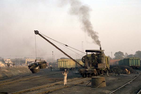 Late afternoon sees the coal grab at work unloading a coal train composed of sealed wagons, to deter theft.