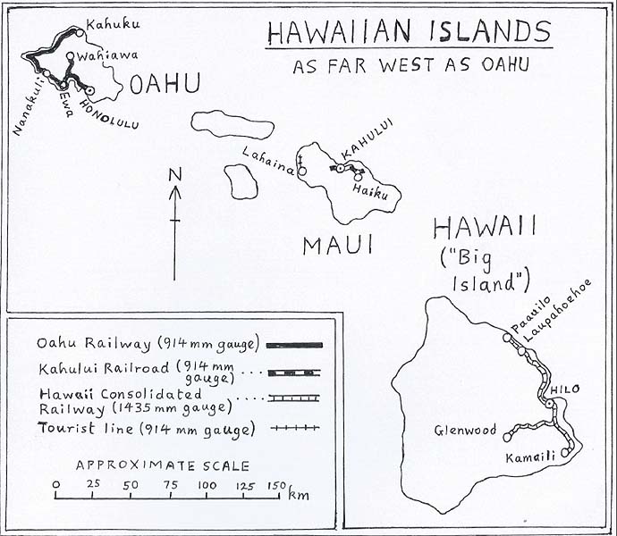 Click here for the other parts: There is a map of those islands of Hawaii with railways at the end of this piece. The Fijian section continues after it. It would seem safe to say that among non-Americans, Hawaii (the USA’s fiftieth state since 1959) is rather little-known as a railway venue. This has, likely, a good deal to do with public railways on the islands having – other than vestigially – ceased to exist most of a lifetime ago. Writing this piece has been a voyage of discovery for the author, who before undertaking research for it, knew almost nothing about the islands’ one-time railways – it has been pleasing to find how agreeable and interesting they appear to have been. I am greatly indebted for information, to John B. Hungerford’s excellent little book “Hawaiian Railroads”, published 1963. Three islands of the group at one time had public common-carrier railways with passenger services: Oahu, Maui, and the “Big Island” of Hawaii itself. These three islands had numerous industrial / agricultural lines also; as did several other islands in the archipelago. In keeping with the American connection, Oahu and Maui’s railways were on the 914mm (three feet) gauge, used widely in the USA and Central America, and to some extent in the British Isles, but rare elsewhere in the world. Fittingly enough, the “Big Island” ‘s lines were of standard 1435mm gauge. Hawaii’s first public railway to open was on Maui – not a place very well-known to those two oceans away, but in fact, for tourists the second most popular island in the group -- after Oahu, which contains Honolulu and Waikiki. The Kahului Railroad, of 914mm gauge, opened its first section to traffic in 1879; progressively extending between then and 1924, when a maximum route length of 31km was reached. It ran east, and a short distance west, from Kahului, situated on the island’s north coast and its biggest town. The twin eastern termini were Kuiaha, and Haiku – the fancy suggests scenarios of the line’s opening to the latter in 1913, being celebrated in pithy mini-poems of seventeen syllables... The district served, used to be Hawaii’s area of most intense sugar-cane cultivation; the chief traffic on the railway was always related to the sugar industry, plus a considerable amount of haulage of the islands’ other prominent crop, the pineapple. (With the vagaries of economics, sugar and pineapple cultivation and agriculture in general, are nowadays reduced to insignificance throughout the island group.) However, general freight was also carried; and for much of the line’s career, it had a passenger service. Passenger workings were withdrawn in 1936. During the steam era the railway’s locomotive fleet comprised almost exclusively, products of the firm of Baldwin: starting with four-coupled tank locos, later “upgrading” to 2-6-0 and 2-6-2 tender machines; the Prairies seeing the great majority of the action for the last few decades of steam. Dieselisation of the KR began about 1950 – started by transfer to the main line, of diesel locos hitherto used on connecting independent sugar-plantation railways which were being superseded by lorries for short runs. By the end of the 1950s, the KR was basically diesel-worked; however, 2-6-2 no. 12 (Baldwin 60690/1928) was retained as spare loco to the five diesels, and usually saw some service at the peak of the cane harvest. No. 12 has been saved for preservation; she is now in the continental United States, in working order, on the preserved Georgetown Loop Railroad in Colorado. The KR continued in traffic until abandonment in 1966. In a context of railways in genuine bread-and-butter service; although outlived by a few years by retained remnants of the system on Oahu, the KR had the longest working life-span – 87 years -- of any single public railway undertaking in the islands. Though the line was not situated in a prime tourist area of Maui, fine scenery is virtually everywhere in the Hawaiian group; the route’s eastern end was definitely scenic, with a number of impressive-verging-on-scary high trestle bridges over ravines. Hawaii has a couple of tourist lines in operation today, as will be covered later; sadly, no preservation initiative came along to save any part of the KR’s route for posterity. Oahu is the group’s highest-profile island on both tourism, and “workaday”, fronts. It was served by the 914mm gauge Oahu Railway; this name will be used for brevity’s sake: official title until 1948 was the Oahu Railway and Land Co. It appears that in Hawaii – unusually on an essentially “USA” scene – the word “railway” was at least equally as current, as “railroad”. The OR’s first sections were opened in 1889. Development proceeded over the succeeding years until 1906, when maximum route length was attained: a main line running west from Honolulu to Ewa and beyond, to follow the island’s south-west coast through Nanakuli, onward and along the north-west coast to Kahuku terminus, plus a branch diverging not far from Ewa and running inland to Wahiawa – the whole totalling about 150km. All the just-mentioned lines carried passenger and freight traffic. After reaching its maximum extent in 1906, the OR continued intact and mostly busy for the next four decades. The backbone of the railway’s freight traffic was the Hawaiian islands’ two great staple crops, sugar and pineapples. Oahu has also had, since shortly after the islands’ 1898 annexation to the USA, a considerable military presence, both navy and army; the OR carried much traffic in connection with this military activity. A very large army post, Schofield Barracks, was inaugurated near the upper end of the Wahiawa branch; with an offshoot of the branch specifically to serve it. Many agricultural lines serving sugar plantations, mostly 914mm gauge but some on 762mm, fed into the OR system. The majority of Oahu’s coasts are rugged and spectacular, with 
