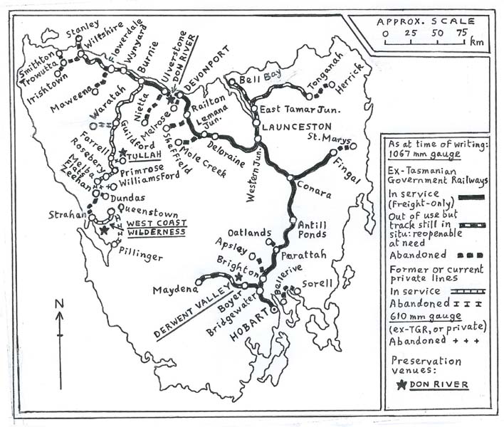 Click here for the other parts: This “Garland” series tends toward refraining from covering the world’s better-known, better-documented, and physically larger islands. Tasmania was for the author, initially a little threatened, as under that heading – but with its being a place which has enchanted me virtually lifelong, as regards its railways and all other features: deciding to give it a spot in the series, did not take long – and after all, “I write this stuff, I make and break the rules as I like”. Many thanks are owed for local information, to Wilson Lythgoe. Tasmania, tucked underneath the Australian continent near its south-eastern corner, is roughly triangular in shape; the longest side measuring about four hundred kilometres, and the other two sides a little shorter. It is the smallest State in the Commonwealth of Australia, and the southernmost; it bears much resemblance to the rest of Australia, except for being -- that slight bit more south and further from the Equator -- more cool, green and lush throughout. It has gentle plains and wolds, and rugged mountains; and plentiful natural forest cover, though now much depleted by man; and wondrously varied and sometimes unique, fauna and flora. The author on sailing-ship topics Alan Villiers, who lived for a while in the 1920s in the island’s capital Hobart in its south, wrote of the area as being then “a wonderland, a rolling forest land of beautiful wooded hills, fern-lined gulleys, and high mountains”. The description holds good, to a fair extent, for the whole island today – plus of course, magnificent coastal scenes and seascapes. In so far as there were any rules to Australia’s strange and wayward way, in the formative times, with railway gauges, things for Tasmania followed “standard practice”. That is, railways serving Australia’s more marginal and outlying areas were developed on the “Cape Gauge” – 1067mm / 3ft. 6in. Thus it was for Tasmania, whose first public lines opened in the early 1870s (initially on the 1600mm / 5ft. 3in. gauge; but so little, and for such a short space of time, that the episode basically rates as ephemeral). A simple description of the island’s network at maximum extent could be; a quite straightforward framework, 1067mm gauge with a few minor “feeder” lines of 610mm / 2ft.width, starting in the south at Hobart: main route running due north to Tasmania’ s second city of Launceston, near the north coast; and proceeding from there essentially north-westward, en route joining the coast and running closely parallel with it, to points not far from the island’s north-western corner. Plus assorted lines / mini-systems branching off in various directions from this main stem. (Incidentally, pronunciation of Launceston is with three syllables – “Lorn-sess-ton”; whereas I gather that the folk of its Cornish original, pronounce their town as “Lanson”.) In several ways, parallels of a kind can be seen between Tasmania, and Newfoundland on the other side of the planet. In a fairly similar league as regards size, though Tasmania is slightly smaller. Also, Tasmania tends to appear to the people of the sun-baked Australian mainland, as something of a chilly and rugged outpost. As with metropolitan Canada and Newfoundland, mainland Aussies have a long-standing and essentially libellous jesting tradition of classing Tasmanians as “country cousins”, lacking in polish and sometimes not very bright. And both islands were long served by fairly comprehensive 1067mm gauge public railway systems. The difference with this last, is that Newfoundland’s rail system is totally defunct; whereas that of Tasmania, though much diminished from its fullest extent, has its main “spine” and a couple of offshoots still in commercial freight action today (passenger services ended some decades ago). The map at the end of the page shows, as best known to the author, the situation at the time of writing. From early days up to the late twentieth century, most of Tasmania’s trackage belonged to the Tasmanian Government Railways. The principal exception was a concentrated cluster (at peak) of largely private lines, taking off from the TGR north-coast line at Burnie, and running south-westward from there to serve large tracts of the island’s wild, mountainous, densely-forested north-west – the prize being the mineral wealth of various kinds located in those parts. The Government Railways system reached a maximum route length of 1040km, almost all of it 1067mm gauge; the north-western “bundle” of private lines adding another two-hundred-and-some kilometres. Throughout, less busy and vigorous traffic than anticipated for some lines, and road competition, raised their heads early -- some branches were distinctly short-lived, with abandonments beginning in the 1920s. The main lines and more substantial branches remained well-used, however. The Government Railways had in their service over basically a century, steam locomotives from a variety of British and Australian / New Zealand (and a couple of German) builders, clocking up a total of some 170 machines of 35-odd different classes. A preponderance of 4-4-0s and 2-6-0s in the 19th and early 20th centuries (some of the latter type continuing to be built for the TGR up to 1937), were joined in the First World War era and after, by two small-in-numbers Garratt classes, a 4-8-0 class, and a 4-8-2 ditto, plus a few 4-6-2s in 1923; and a new Pacific type, class M, introduced surprisingly late – the start of the 1950s – plus at the same time, the new H class of 4-8-2. Oddly, TGR’s first big orders of diesel locos entered service at that identical time. The eclipse of steam traction by diesel in Tasmania conformed fairly much to the time-pattern for that process, in Australia generally. Internal-combustion railmotors were introduced around the World War II period or before; diesel locomotives came on the scene in some strengt