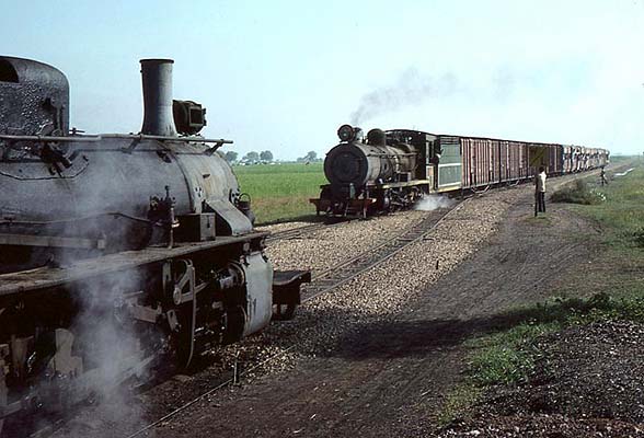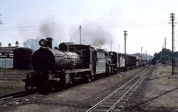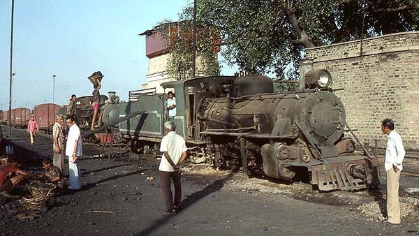 Wilson Lythgoe has been circulating friends with some steam pictures taken some time back and with his permission and encouragement they are reproduced on these pages and will be added to from time to time. Click here for the index. The two lines heading out from Gwalior, in Central India, were 2 foot gauge with what seemed like huge locos (around 30 ton) running the two, well laden mixed trains that were the only services on each line. Both lines were lengthy with the trip to Bhind taking six hours and in the other direction to Sheopur Kalan twice that. All jobs were lodging turns and the box in front of the smoke-box door holds clean clothes and food for the 3 loco men overnighting. I was lucky enough to score a cab ride for 3 hours on the Bhind line: my notes say the cab was surprisingly roomy even with 4 on the footplate but very hot. I had been warned by staff that maintenance standards were low and breakdowns common. On the way back to Gwalior the tender dropped a brake shoe, ran over it and derailed itself. From a letter to my parents at the time: ".....most passengers seemed to be trudging off in various directions so I tagged along behind a group that seemed to be heading back to the last station about 2 miles away. Once there I was at a bit of a loss as to where to go next so walked around saying 'Gwalior' to people. A young lad got the gist of my problem and intimated to stay with him as that was his destination. We walked a short distance along a track to a dirt road and then rode on a farm trailer, behind a tractor, out to a sealed road - that was uncomfortable enough but the worst was yet to come. Above the cabs on Indian trucks there is a wooden shelf with 18 inch high sides where they carry tarpaulins.....and that's where I along with 8 others rode the 50 km back to Gwalior. Uncomfortable, bone jarring, cramped, ducking to avoid low trees and power lines - let me assure you have never been so uncomfortable in my life. A half hour walk back to my hotel from where the truck left me and I still beat the train back by half an hour, had it been on time." My train finally arrived back in Gwalior, combined with the breakdown train, the following day around 20 hours late. Next day I had 5 distinct bruises down my spine from the truck ride! NH/3 754 (2-8-2 by Kerr Stuart in 1928) on the 180 degree curve leaving Gwalior