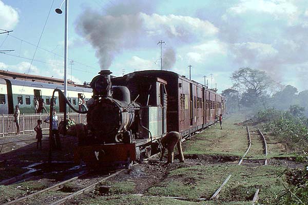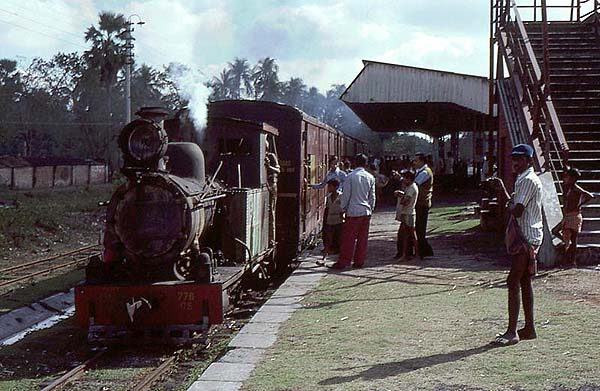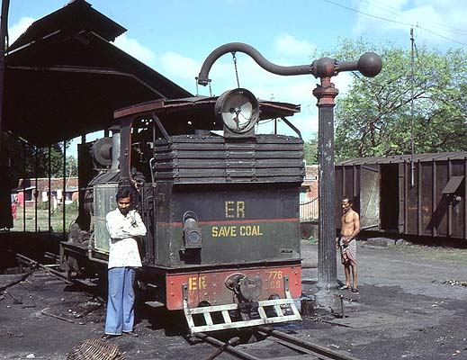 Wilson Lythgoe has been circulating friends with some steam pictures taken some time back and with his permission and encouragement they are reproduced on these pages and will be added to from time to time. Click here for the index. The line based at Shantipur, north of Calcutta, was completely different to the Gwalior system. The gauge was 6 inches larger at 2ft 6in but the locos were tiny. They must have been the smallest engines then being used by the Indian Railways. The CS 2-4-0T shown here had been built by Bagnall in both 1927 and 1935 and weighing in at only 11.75 tons were minute. Their coupled wheels were only 24.5 inches in diameter with the leading wheels a mere 16 inches diameter. They were were dwarfed by the coaches they hauled. Four passenger trains, with very few riders, ran daily over the 28km line and it took an hour to cover the 10 km from Shantipur to Krishnanagar at a very gentle trundle. Another one of India's many railway gems! There were 6 of these locomotives in all, 3 from Bagnall and 3 from Yorkshire Engine Company. 4 were given All-India numbers in 1957. The other two ended up in East Pakistan at the time of partition working on the Khulna - Bagerhat Railway which was converted to BG in 1970. (One of these other locomotives is preserved at Saidpur Works in Bangladesh. RD) Technical Information taken from Indian Locomotives: Part 3 Narrow Gauge 1863 - 1940 by Hugh Hughes. 776 (1935) on shed:
