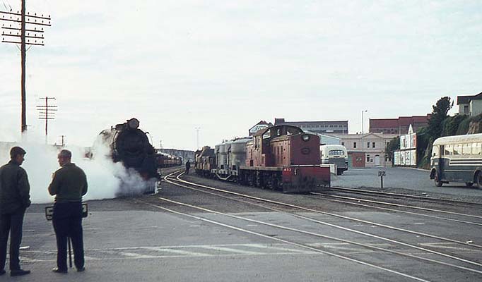 The next morning, just after sunrise, Ja 1245 waits to head north from Timaru. A young Paul Markholm chats with the level crossing keeper. We've both been awake for around twenty four hours now so the photo positions are pretty unimaginative! The Railways buses and the diesel shunter add to this scene from long ago.