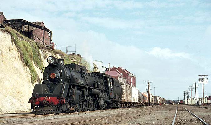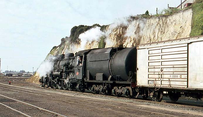 Ja 1240 arrives at Timaru with a goods from Christchurch. In the background you can see the signal box and semaphores that were at the north end of the yard. The shunter could be telling the fireman about the 'idiots' taking photos...