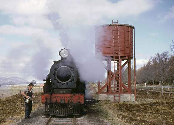 Wilson Lythgoe has been circulating friends with some steam pictures taken some time back and with his permission and encouragement they are reproduced on these pages and will be added to from time to time. Click here for the index. The writing was already on the wall for the Fairlie Branch with the Minister of Railways having announced in August that the thirty five mile line from Washdyke to Fairlie would be closed on the 1st March 1968. The New Zealand Railway Observer (No 113) said at the time: "The recent review of branch lines had disclosed a steep decline in the quantity of goods carried on this line in recent years as a result of changing transport patterns. Whereas, for example, 22,100 head of livestock were carried in the 1963-64 financial year, last year only 450 head were carried. Served by three goods trains a week from Timaru the line was now operating at a loss of some $43,000 a year. Accordingly, having regard also to heavy expenditure on track maintenance necessary during the next few years, and the probability of a further reduction in traffic, Government had decided that retention of the railway could not be justified." I spent the night with relatives in Timaru then the following morning, after first getting the necessary permission, boarded the guards van of train 244 for the run inland to Fairlie. First stop of the day was at Washdyke Junction to pick up two more passengers: local lads off for a days fishing near Pleasant Point. Train engine, Ab 617, was from the first batch of the class and built by Railway Department Addington Workshops in 1916. The Ab went on to become the most numerous type of steam locomotive in New Zealand and as late as 1967 was still playing an important role in the South Island although now mostly on branch line trains.