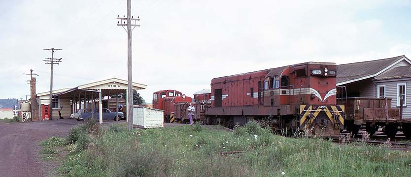 Wilson Lythgoe has been circulating friends with some steam pictures taken some time back and with his permission and encouragement they are reproduced on these pages and will be added to from time to time. Click here for the index. As I began to write this tale I recalled a picture of train 77 that had appeared in the New Zealand Railway Observer a long time ago. It took a while to hunt out as it was published back in 1967 but it was taken at Auckland in 1952 with part of the caption reading: '.......train 77, the 8.15pm goods with car attached, due to reach Whangarei at 3.30am, and Opua at 8.51, the next morning. Strictly for the hardy souls.' That's around 300km in twelve and a half hours....for hardy souls indeed! By the time of my 1973 visit though train 77 only had the carriage attached at Whangarei for the eighty six kilometres north to Opua. Along the way it passed through Otiria, the starting station for the Okaihau bound goods with car attached I covered in an earlier tale. With a bit of luck you would have been able to transfer from one train to the other at if you were travelling north but I doubt anyone ever did. Coming south would have meant overnighting in Otiria so that really wasn't an option. Today's tale though is not about some fanciful connection in the backblocks of New Zealand but of the Whangarei to Opua and return service. Train 77 was due out of Whangarei at 5.30am returning as train 1048 leaving Opua at 09.30am. I got my first sighting of 77 at Otiria: Da1435 was in charge with a dead Tr171 included in the consist. Although the carriage is hidden by the station building there's lots to interest in this shot of a New Zealand Railways that has long since disappeared.........