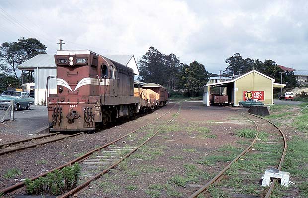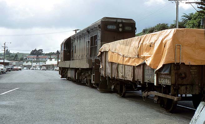 The railfan hotspot in the area was the street running section at Kawakawa and the following day I staked it out waiting for 77 to appear. It was a lengthy wait but eventually the train turned up: I wrote on the slide 'Da1512 three hours late'. I've cropped the photo quite severely to produce this slice of small town New Zealand 1970s style.
