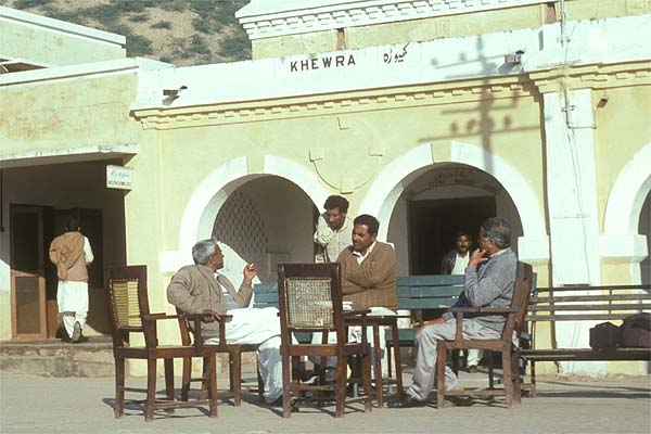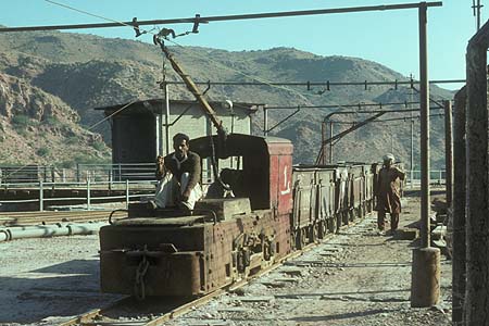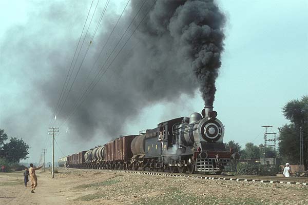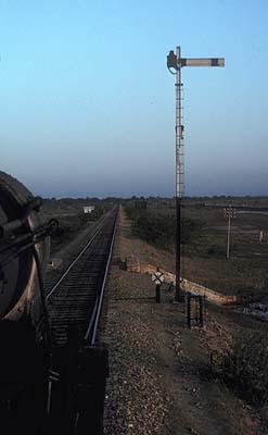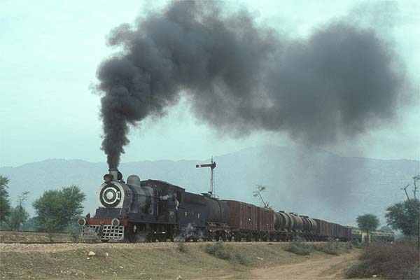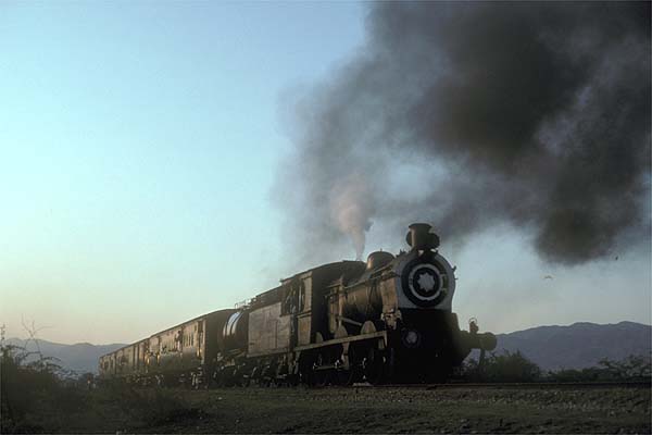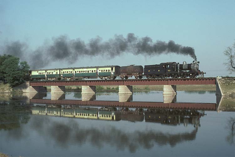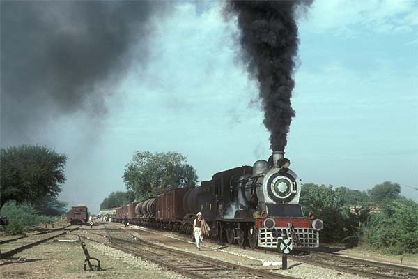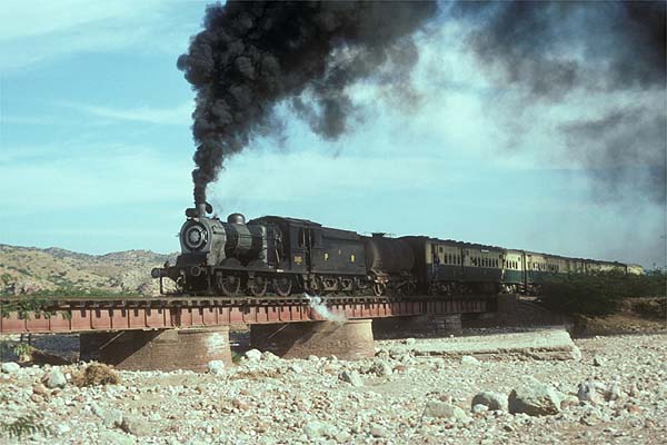 After my ride to Sarghoda and back, safely in the railway bungalow, I was fed and watered by the resident attendant who brought me delicious, if somewhat repetitive, meals. As I recall, he had been pensioned off from some operating department after an unfortunate accident had left him lame. I was also 'adopted' by a young lad, Saeed Ahmed, from the town who was very helpful during my stay, I helped improve his English and in return he procured me a bicycle. Next day, it was time to catch up on SGS activity. Knowing I would want to photograph them in action the inspector put us on a diesel hauled train across the river to (I suspect) Haranpur and from there local transport to await the arrival of the daily train to Khewra, the line onwards the short distance to Dandot being closed owing to a landslip. The 'Great Salt Range' is appropriately named as there are salt mines in the area and a factory owned by ICI processed it nearby. We went off and waited by a dry river bridge just outside the station. I think my companion was worried we might be taken by surprise by the train's arrival but there was no chance of that happening as it crawled up the hill with a plume of jet black smoke which at times threatened to engulf SGS 2410.