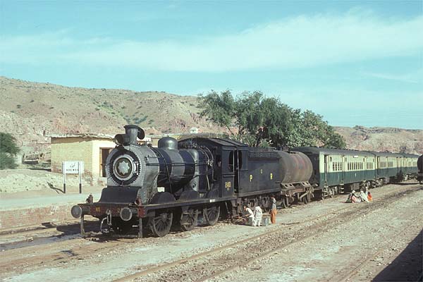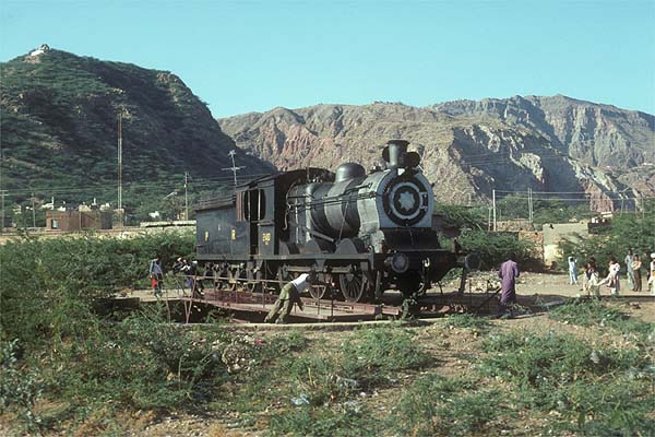 Next day, it was the turn of the Gharibwal branch train, being an entirely flat run, the train was quite a long one. With no turning facilities at the end of the line, and the line running more or less north/ south, it was essential to send out SGS 2471 tender first so it was right for the return working. Gharibwal had a cement factory with its own diesel and here also was abandoned SG 1055 which belonged to the irrigation department. Gharibwal is close to the Salt Range as this departure picture shows: