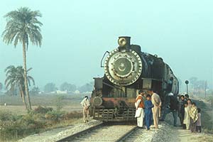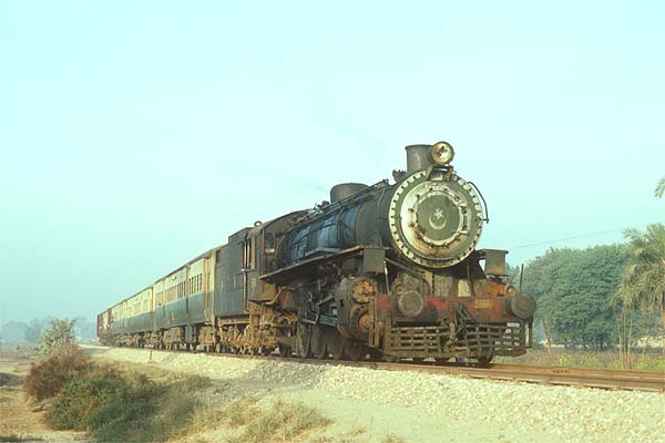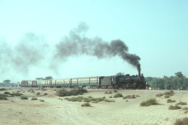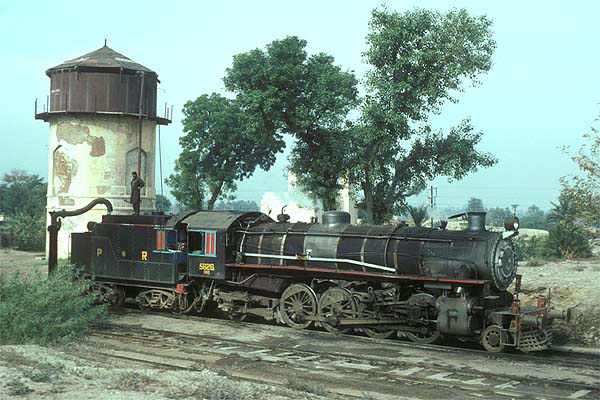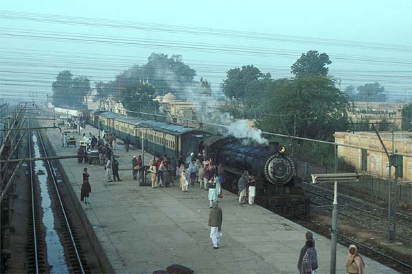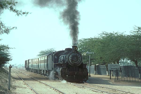 After a couple of days on the metre gauge at Mirpur Khas which I could quite happily have extended, Samasata was, frankly, a bit of a let down. It wasn't just that I would have to sort everything out for myself (I added it to my schedule after I arrived in Pakistan when I heard that steam was still active) but the fact that the only active steam was a sparse service on the branch to Bahawalnagar and then on to Fort Abbas. My recollection is that the station turned out to be more or less in the middle of nowhere and that I decided that I would have to claim a permission I certainly didn't have to use a room in the railway bungalow. Once again the first class pass which by now was rather tatty came in very useful. I think the timetable required two locos with an overnight lay over either at Fort Abbas or Bahawalnagar and I ended up spending two not very successful days photographically riding part way down the branch, by now I was more or less exhausted and the adrenaline no longer worked. I do know I got at least as far as Hasilpur before returning with presumably a diesel working as I have no pictures of it! I photographed CWD 2-8-2 5690 on the first day and sister loco 5626 on the second. To me the most interesting feature was one of the early stops which carried the delightful name 'Baghdad' - a slide to surprise those who might think that it was taken some distance to the west... Firstly this is 5690 waiting to depart Samasata in the early morning: