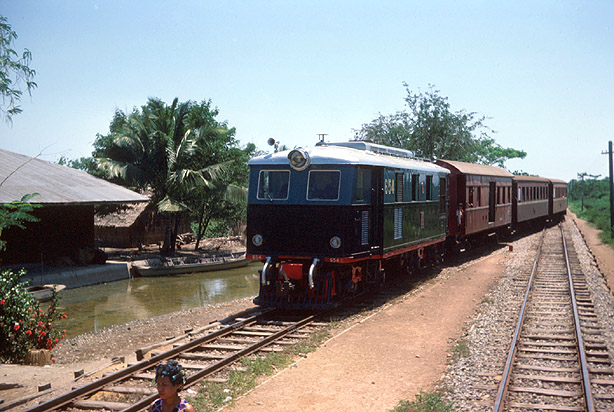 Bo-Bo 654 was ordered from the same manufacturers as 504 before the Second World War, but could only be delivered after it. It, too, was cascaded to the Maeklong railway where it was seen working on one of the more rustic sections in April 1975. (RD) |