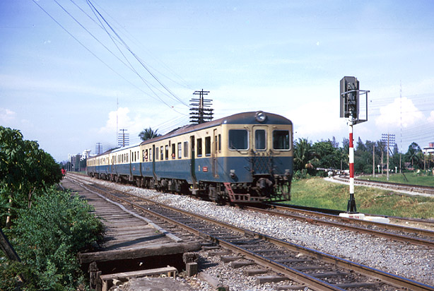 Contemporary with the Hitachi locomotives and carrying a similar livery were a series of Japanese built railcars which mainly worked the lines to the north of Bangkok. This picture was taken at the junction with the eastern line in April 1974. (RD) |