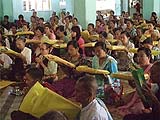 This page contains links to our second 2009 visit to Burma mainly to film and research stationary steam engines in the country's rice mills but also to enjoy a very special country. Summary technical information is available on a separate introductory page. From Burma we went to Thailand and on south to Penang, it's pretty bland in comparison but it's where I started out in south-east Asia nearly 40 years ago, but it was still a very special sentimental journey. We visited Burma in early 2009 on what was probably our most interesting and successful trip here. We returned in late September 2009 to try to complete filming for a DVD about the village of Dakhondaing and its steam powered rice mill. It turned out to be a longer (and much more expensive and frustrating) trip than anticipated but the severely delayed start to the harvest gave us a window to revisit parts of the Irrawaddy Delta. We arrived in the rain and over the next 4 weeks the country changed colour as the universal rice crop ripened. Alas the extended rains were no respecter of our visa validity and we had to leave before harvesting could start. If your interest is in stationary steam as opposed to general travel, be warned, most of the steam engines are in the later reports but also in the more unexpected of places. And if you are potentially either a 'package tourist' or a 'Lonely Planet traveller' to Burma then best you 'look away now' because there is almost nothing here that you stand any chance of being able to see on your own visits. As always the actual reports try to be as objective as possible and I try to save the editorial comment for this main page. This time we saw some very poor people spending a high proportion of their very small disposable income on pampering a set of Buddhist monks who lead a comfortable if basic life. It made for some spectacular video, but it begs the question as to whether a significant proportion of the money could have been better donated to the local school in the form of much needed books. We are not allowed to film in schools, to be fair this would be true in many other countries too, but even from the outside it is very obvious that the government does very little more than pay the teachers' salaries. The peoples of Burma have no choice in who governs them but any sympathy I might have had for their predicament has largely been dissipated over the years as I see more and more begging bowls and more and more pagodas being built and restored. It's all a question of balance, and it seems to me that if China is a country with absolutely no soul at all, then Burma has got far too much of it. No one would ever claim Thailand was perfect (for a start it's almost ungovernable) but it does seem to know collectively that there has to be a middle way between the 'here and now' and reincarnation. If you are new to the joys of travelling in Burma, you might care to read Keeping Body and Soul Together in Burma (2006), since when not a great deal has changed. The roads have got a bit better and because train fares (collected in USD) are unchanged, going by rail is much more competitive and these days much more reliable with an influx of equipment from India and China (we used trains 35 and 36 twice each and only once were we as much as an hour outside right time). On a practical note, this is the current timetable for trains between Yangon and Mandalay/Moulmein as displayed at Bago station in mid-October 2009, by the time you read this http://www.seat61.com may have a more up to date version but it was out of date as of the time this page was composed:
