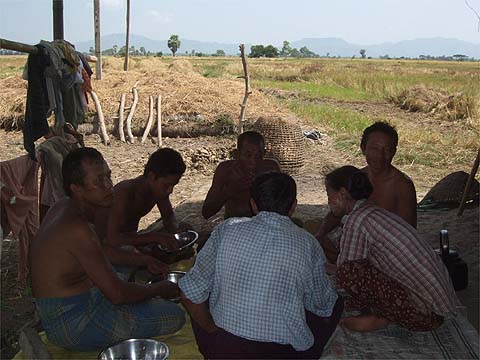 The half dozen harvesters demolish a breakfast which has been prepared by our lady's son-in-law who is outstationed here for the duration, load themselves up with betel nut and vanish into the field next door. They have been shipped in from the middle of Irrawaddy Division because all the available local labour has decamped to Myawaddy on the Thai border where they can earn far more than the 4000 Kyat a day on offer here (USD 4.5 at the current market rate). Frankly, you'd have to be pretty desperate to take such a job, I'd rather cut sugar cane in Java. Cutting grass all day doesn't sound too bad, except that the fields haven't yet dried out properly and the quality of the rice plants is so poor that the stalks have collapsed under the weight of the seeds. It looks as idyllic as a Constable painting of an English harvest but it's back breaking work gathering the tops of the stalks for later separation of the seeds.