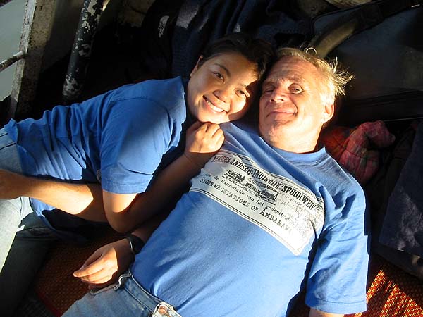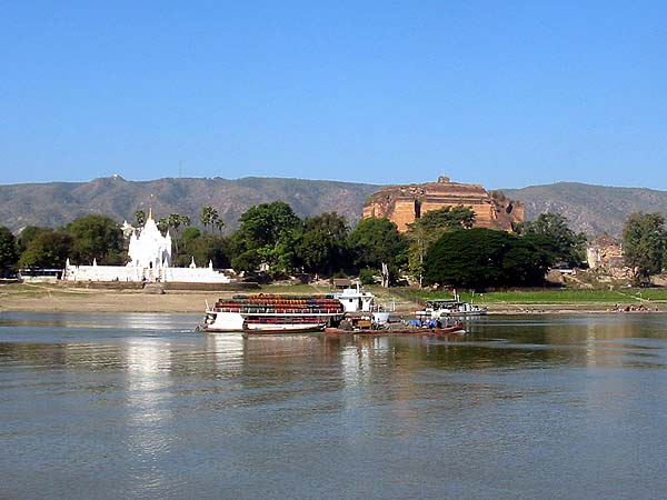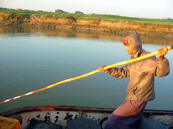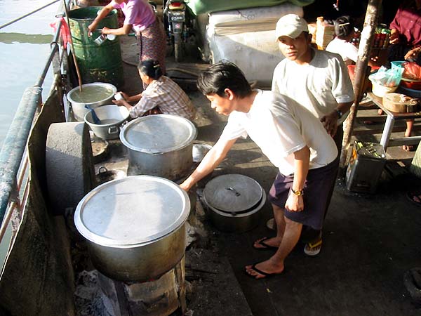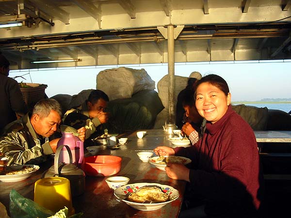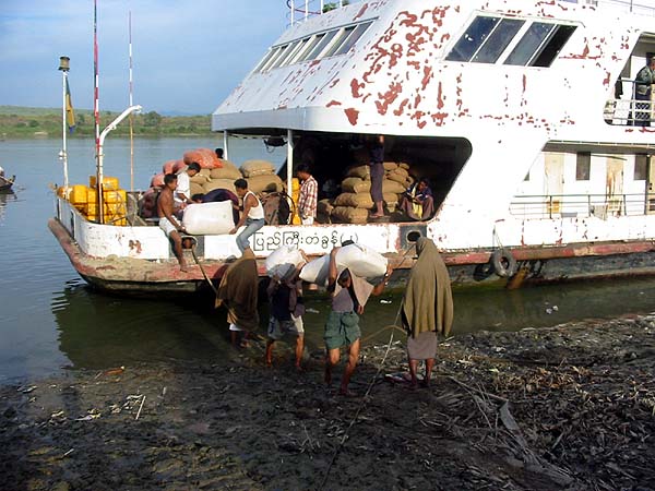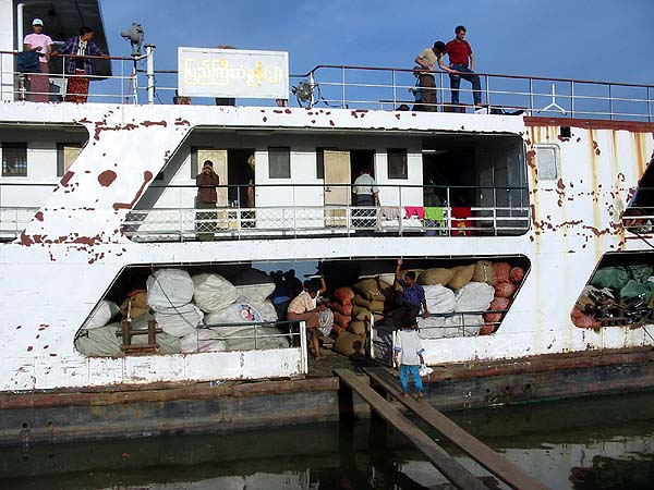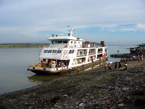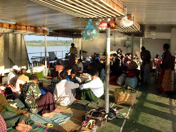 A gentle cruise down the Irrawaddy from Katha to Mandalay evokes all sorts of romantic images: The reality depends on whether you have 'been there, done it and got the T-shirt'.... Alas, I have seen thousands of beautiful pagodas (complete and ruined) and almost as many beautiful sunsets. I have seen clear night skies from the summits of volcanoes in Java and from the comfort of our country house near the Great Wall north of Beijing. However, I do confess that a fleeting glimpse of a pair of Irrawaddy dolphins as we passed Mingun (second picture above) was rather special. Take one modern boat, lovingly built to the highest possible international standards... and ask the Burmese to road test it and make a few modifications to make it suitable for local conditions: State of the art sonar depth detector to avoid the sandbanks: Special roll on/roll off freight facilities: Flexible access for passengers, extortionately priced cabins for the lucky(?) early bookers above: Well designed 'open plan' seating and sleeping space: Hygienic kitchen, with rapid waste disposal: