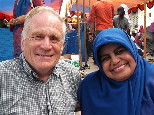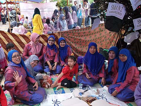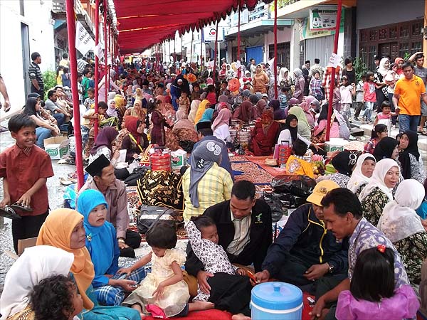On the appointed day, we were somewhat reluctant gate crashers to the street party. Groups such as schools, clinics and businesses had laid out their communal meals ('Makan Bajamba') on mats down two of the main streets which had been temporarily covered against the equal possibilities of rain or strong sunshine: