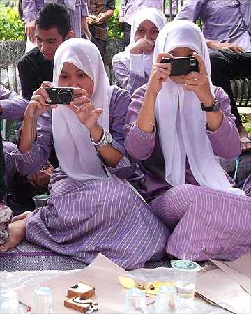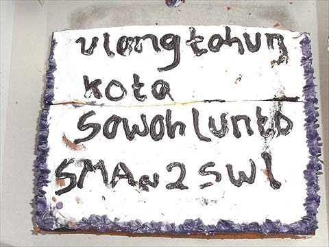 :We ate with a group from Sawahalunto's Senior High School, they had already started on the cake when we arrived: