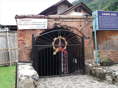 There is a well advertised heritage trail round Sawahlunto and the tourist offices have a good supply of leaflets on the various attractions. We passed on the Go Karting and Zoo (at Kandi) and the Water Boom, but we did visit the Mbah Soero mining tunnel and the nearby Goedang Ransoem Museum, the admission fees are very modest. The 'Info Box' building houses some more old pictures and will equip you with boots and a helmet to go underground into what was the first mining tunnel in Sawahlunto in 1898. Later abandoned, it took 3 weeks to pump the water out when it was re-opened and indeed the lower levels remain closed to the public. Among the various prohibitions listed we found that of photography not to be enforced. Outside is an anti-colonial statement - Gerard de Graaf assures me that the wagon is probably original, a common design adopted by the Dutch based on one produced by the German firm Pfingstman in Recklinghausen. The tunnel entrance is kept locked when not in use.