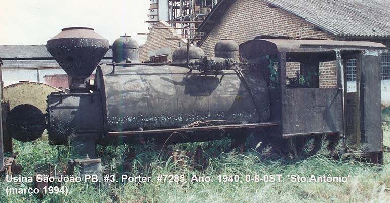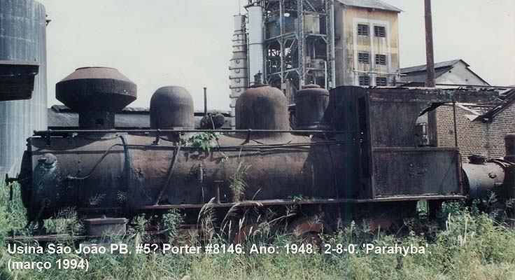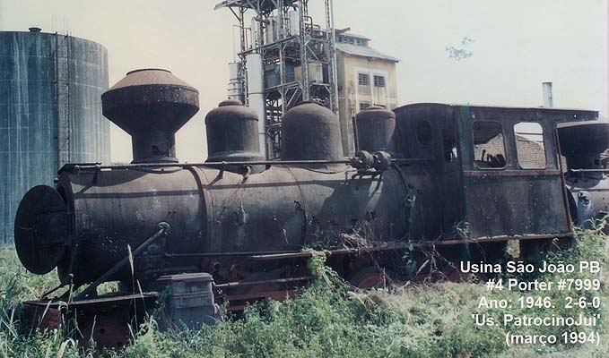 No.4, Porter 7999, 1946. Mogul. 2-6-0. "Potiguar". Abandoned in the yard at Usina São João in March 1994. The Inventory of Steam Locomotives in Brazil has a photo of this locomotive in a very derelict state at the Tubarão railway yard in August 2006