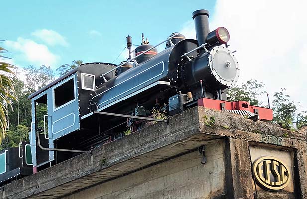 (3) Now incongruously displayed on a remnant of a railway bridge at the Tex Cotton factory in Blumenau, southern Brazil. The display suggests that it once ran on the EFSC (Estrada De Ferro Santa Catarina), which is not true. Sadly, although the renovation was complete enough for the locomotive to actually run, there is now no possibility of seeing this Porter in operation.