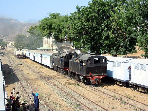 The first organised tour group visited Eritrea in December 2000. In November 2002 there were two more, I joined the second one (run by the LCGB). There are four other sections to this report: Massawa (0km, 2m) to Ghinda (69km, 888m) Section We spent a total of 4 days in this area (24th - 27th November). The first day we went down from Asmara and took 442.54 and 442.59 with a train to Massawa. Near our destination the helpful staff moved the locomotives to the 'wrong' end so they could propel the train and perform a series of runpasts. Next day, we had just 442.54 between Massawa and Ghinda (and returned by bus), repeating the journey next day with both locomotives. On the final day we took the bus to Demas (a mere 8.5 km of very traditional dirt road with three evacuations of the bus to clear gullies) and then took the train on to Ghinda. This was probably the best tactic, since attempting the whole run restricted the time we could wait for the sun to appear at runpasts, also the Ghinda area tended to cloud up quite early in the afternoon. Apart from the first one, the pictures are presented in journey order, rather than chronological order. 442.54 and 442.59 ready to depart Ghinda for Massawa (our diesel shadow is on the left).