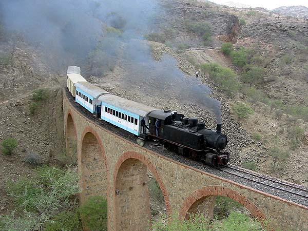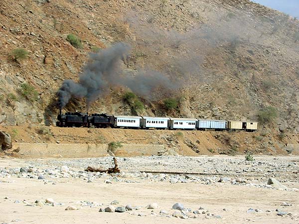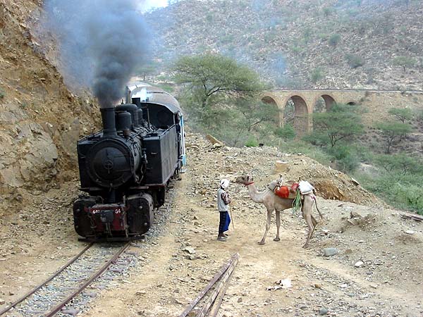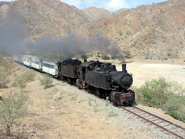 Towards Baresa (57km, 600m), the railway joins a narrow river valley and broadly follows it all the way to Ghinda. Several sections are carried on a ledge. The river itself sees water for just a few weeks in any year, we were there in the dry season and only near Ghinda was there a hint of a trickle.