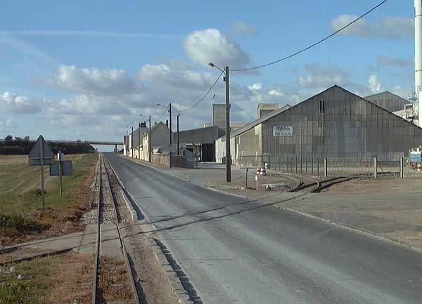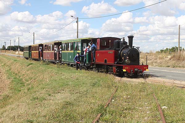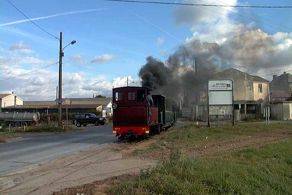 No's. 2, 5, 9, 10 and 12 have been in working order in recent years. Pictures (all taken on 6th October 2002) This view from the rear balcony of a train returning to Pithiviers from Bellebat gives a fair idea of the character of the line. The standard gauge crossing is in the foreground and there's a standard gauge diesel serving the factory partly in frame at the extreme right. The Pithiviers bypass bridge is in the distance.