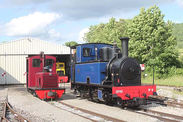 As of November 2013 the former site Trains operate behind steam on Sundays and holidays from May to September (14.45 & 16.30), on rare special occasions two locos are steamed, while diesel trains operate Monday to Saturday in July and August (dep. 15.30). On Sunday afternoon on the way back from Auxerre I paid a visit to the 6.8 km long C.F. de la Vallée de l’Ouche (CFVO). It was built on a section of trackbed of one of France’s oldest railways, the standard gauge C.F. d’Epinac coal railway linking the mines at Epinac with the Burgundy canal at Pont-d’Ouche opened in 1829. The line was later extended on both sides, in the northeast to Dijon, and taken over by SNCF as a rural secondary railway. The section on which the CFVO was laid was closed in 1968, with the station at Pont-d’Ouche demolished to make way for a pillar of the large A42 highway viaduct. The 600mm gauge was chosen for the CFVO for cost savings, better availability of rolling stock and the reduced space needed to build a loco shed and yard. Reconstruction was started in 1973 with the 2 km section to Oucherotte opened in 1978. From then, the line was progressively extended via Les Cudilles (km 2.6), Pré-Magnien (km 3.5, loop), Thorey-sur-Ouche (km 5.0), La Garenne (km 6.2, loop and water tower) to Pont-d’Ouche (km 6.8) until 2007. In 2004 an agreement was reached to be able to again cross the D33 on the level, however with no possibility of again reaching the Burgundy canal due to the highway viaduct pillars it was decided it was not worth the extra costs. At Pont-d’Ouche there is no loop, so the loco pushes the train back to La Garenne, where it runs around. The road runs east of the line and with public trains operating only twice on Sunday & holiday afternoons from May to September photography is a challenge. A morning steam charter would cost EUR 350 (there are a few goods wagons available). Blue 2-6-0T No. 8 (La Meuse ALM 3932/1938, 13/16.5t, ex Sucrerie de Maizy 8, Aisne) was the only steam loco here which I had not previously seen in use, it was the last to be restored to working order. It is privately-owned and came here from Montalieu (ex Meyzieu). MTP Pithiviers has No. 3931/1938. Green 0-6-0T No. 7 BURGONDE (Couillet 1586/1910, 1965 ex Sucrerie de Maizy 7, Aisne) is classified as a National Monument. It came to the CFVO via the CFTM/CFHR Meyzieu/Montalieu, a first stint on the CFVO and the CF de St-Eutrope south of Paris, where it was No. 3.3 ORIANE. Red 0-4-0 No. 020 TJ 1 (Decauville 6034/1947, 9.2t, ex Ateliers et Forges de la Loire, regauged from 640mm) is coming to the end of an overhaul, it should be back in use later this year. Its four-wheel tender was built using a Motor Rail diesel loco frame. Stored inside the shed is TPT 0-8-0T No. 4.13 (SAFB KDL11/HF160D 2844/1945, 18.3/22.0t) which is owned by CFTM/CFHR and has been here since 2000. There are no plans to restore this heavy loco to working order. Five diesel locos are also on the roster (Jung 21, LLD Deutz 22, Motor Rail 23, Poldi 24 and Plymouth 25), all of which except for the Plymouth (which is privately owned) have received new bodies to make them look more like narrow gauge locos (in the eyes of the French members of the CFVO). In July and August the railway operates a daily diesel train from Monday to Saturday, hauled by the Motor Rail. The passenger stock consists of eight coaches: four open ‘balladeuses’ on DFB bogies, two of which have recently been converted to allow the transportation of wheelchairs, two permanently-coupled closed coaches on Péchôt frames and two-semi-open coaches on MAV bogies. A four-wheel brake-van for the conductor and to transport drinks for sale is incorporated into the passenger trains. A mixed open coach/van is currently under construction in the workshops. The goods/service wagon park is made up of an open wagon, four Péchôt Artillery flats (one with a water tank, another converted into a track-laying crane) and two Pershing frames, plus an assortment of four-wheel wagons and trucks. Green 0-6-0T No. 7 BURGONDE Red 0-4-0 No. 020 TJ 1 Motor Rail 23 Blue 2-6-0T No. 8 |