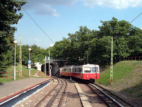 The rack railway is out to the west of the city. Varosmajor, the lower terminus, is easily reached by the number 56 tram which starts at Moskva Ter, something of a public transport hub in Buda and reached from the city centre by Metro line no. 2. The first of the pictures shows the train approaching the train from the depot immediately to the east. The other picture shows the train approaching Szechenyi-hegy station which is about 5 minutes' walk from the southern terminus of the children's railway -