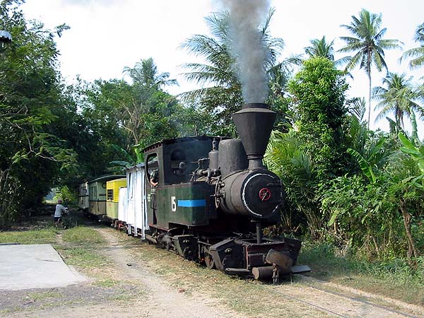 43. PRAJEKAN Mill Index The serviceable smaller locos were reallocated to De Maas and Asembagus some years ago. The other locos remain in store, a tragic end for the magnificent Luttermöllers. 44. ASEMBAGUS Mill Index 5 has expired with boiler failure, 0-8-0T 3 has been renumbered 10 and 0-6-0T De Maas 3 (2) is here as 11. On 27th June, both were due to work south of the mill in the afternoon but in the event only 11 did so before dusk. It was sent to collect 13 cane loris from about 2km out. A combination of a big derailment on the temporary track and loose couplings which came undone delayed our return as usual, although the crew did their best to assist photography on this tender first working. Olean it is not, but it was good to experience field working again here after a long break. 11 performed for my group with a couple of vans on the south line on July 25th and on the east line on August 2nd. On the second occasion we stayed on and found 11 at work on the east line in the afternoon too. On 12th/13th September I stayed at the mill guest house to ride the trains. On the first day 10 and 11 were in action on the south line. On the second day, there was only diesel activity and we rode out with an old OK diesel almost to the edge of the Strait of Madura where I had time for a swim.... Click here for my private afternoon at Asembagus. My tour groups did very well here this year: