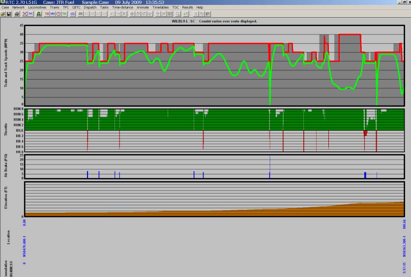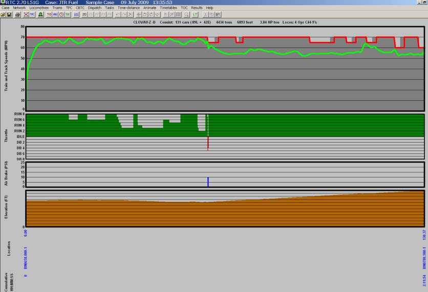 All 2-8-8-2 performance data is estimated from the Porta proposed Third Generation In the past, it has been said that the cost of fuel for steam locomotives sitting at idle was high. Today this wouldn’t be the case, due to better design and low fuel cost. The 2-8-8-2 described above would cost 10 percent of the cost of an Auxiliary Power Unit (APU) equipped diesel locomotive sitting at idle. Also, the 2-8-8-2 would have a fuel and water range six percent greater than the ES44AC, due to its low fuel consumption and large tenders. US Class I railroads use a computer simulation model to simulate capacity and train performance. The Class I railroads have standardized on the Berkeley Simulation Software Rail Traffic Controller or RTC rather than on other competing simulation programs. This model was used to compare the performance and fuel consumption of the 2-8-8-2 and the ES44AC. RTC includes a train performance calculator (TPC) which was used to compare the performance and fuel consumption of modern steam and diesel locomotives in a simulated railroad environment. The steam versus diesel simulation comparisons were made on the Norfolk Southern Pocahontas District between Bluefield and Williamson, West Virginia, and BNSF Railway Clovis Subdivision (a section of the Transcon), between Clovis and Vaughn, New Mexico. The NS section has heavy grades (1.4 percent); many sharp curves (10+ degrees); 25-40 mph speed limits; and heavy tonnage (20,000-ton trains). In contrast, the BNSF section has moderate grades (0.8 percent); few curves (1 degree); 60-70 mph speed limits with fast trailer and double stack trains. Current operating practices and procedures of the railroads were used in the simulations. Screen prints from individual runs of trains on the train performance calculator are shown.