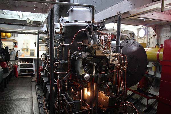 About two miles outside Puno, along the railway towards Juliaca, SS Coya is beached. She is used as a function room /restaurant. Coya was built by Denny of Dumbarton in 1893. Two of us on the tour decided we wanted a closer look (she was fairly close to the hotel) and walked over. A man who was apparently the caretaker noticed our interest and produced the keys allowing us to look on board. She was most unusual; The engine was a compound, but with each cylinder connected to a separate crankshaft, hence propeller! There was only one set of controls and telegraph, so the propellers always worked together! A condenser was built into the engine frame between the two cranks. Steam was provided by two oil fired twin furnace scotch boilers.