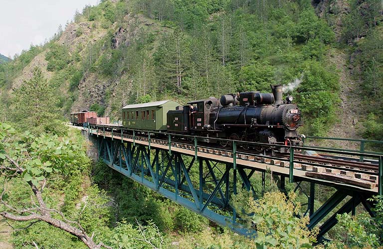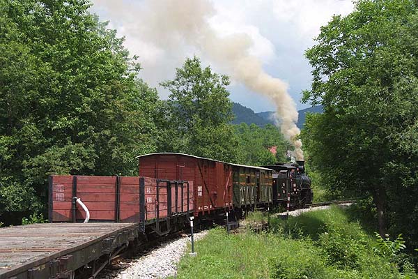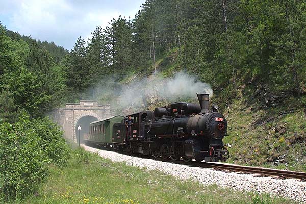 James Waite has sent some pictures dating from his visit in June 2008, which show the rapidly developing Mokra Gora 760mm narrow gauge operation, at this time the extension westwards from MK across the Bosnian border to Visegrad hadn't opened. It's probably just as spectacular as the Sargan stretch although quite different in character (will somebody please send us a report and pictures? RD) One of the troubles with MK is that the public trains are diesel-worked for which the railway has several ex-Romanian locos, the usual Faur Bo-Bo type. You're therefore obliged really to join a group for the trip in order to have a steam run. This was a trip which Zoran Veresic arranged for Frank Stenvalls, the Swedish publisher, and a group of his friends. The usual pattern of operation