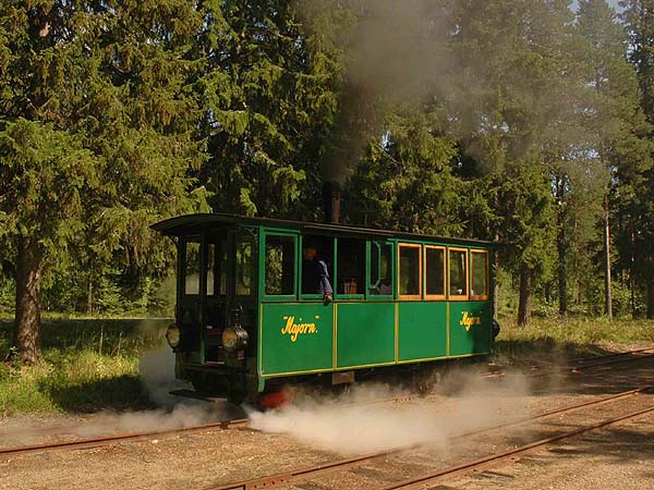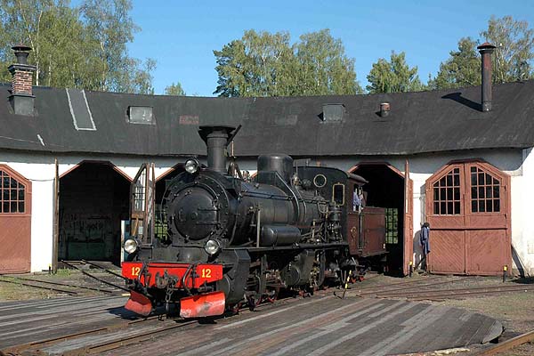 James had a flying visit here on July 2016, on a non-operating day. The major impending change is that "Mallet no. 12 is coming to the end of the road for the time being as its tyres are worn to almost nothing - and anyone wanting to see it in action might do well to go sooner rather than later. There's some possibility that Mallet no. 8 will be operational instead before too long but it's not yet a runner." James Waite reports on his visit in July 2006. The Jädraås–Tallås Järnväg is one of the best of the Swedish preserved lines and runs for a distance of 6 km in the Gästrikland region about 60 km northwest of Gävle. It is the surviving remnant of the Dala–Ockelbo–Norrsundet Järnväg (DONJ), an 891 mm gauge line running eastwards from Linghed for 86 km to Norrsundet on the Baltic coast. The railway was built principally to handle the traffic in timber and metal ores which were exported through Norrsundet. It closed to passengers in 1959 and to all traffic in October 1970 when the JTJ organisation took over the stretch between Jädraås and Tallås. In 2004 the line was extended for 1.5 km westwards from Tallås to a new station at Svartbäcken. For much of its distance the present line runs through the pine forest characteristic of central and northern Sweden and alongside an lake though it's difficult to get the lake into lineside pics. Jädraås must have been an important operating centre for the old railway with a substantial loco roundhouse, works, a forge, store buildings and passenger and goods stations, many of which still survive. Some are built from the local slag-stone acquired from old blast-furnaces and some from the red-painted timber which is so characteristic of many buildings throughout Sweden. One of the most distinctive features of the old DONJ was a series of three large 0-6-6-0 Mallet locos, nos. 1, 8 and 12, built for it by Atlas of Stockholm in 1910 (James knows I have a soft spot for Mallets having seen lots at work in Indonesia. RD). Two of these locos survive today. Other survivors from the DONJ include a remarkable vertical-boilered 4-wheel steam railcar built by Atlas in 1888, an equally remarkable vertical-boilered steam inspection vehicle built by the railway itself in 1898, a similar-sized petrol driven inspection trolley dating from 1910 (locally built for the Ågsbanan, a DONJ branchline) and a considerable number of its carriages and wagons. The preservation of so much of the old railway’s rolling stock and the extensive group of original buildings make make this a really fascinating place with oodles of authentic character. There are plenty of photographic opportunities around the loco shed and buildings at Jädraås. Out on the line much of the route is hemmed in by woodland. Much the most photogenic spot is a 4-span girder bridge over the river just to the west of Tallås station. Notes on the steam locos No. 2 “Korsån” - A tiny 0-6-2T (Falun works number 21 of 1902) built for the Ågsbanan. A delightful little engine. No. 4 “Sigbjörn” - An 0-6-0T (Motala works number 273 of 1901) rescued after the closure of the Byvalla–Långshyttan Järnväg ('BLJ'), an 891 mm gauge line about 80 km to the west of Gävle where it ran as their no. 8. The BLJ closed in 1964 No. 8 - One of the two surviving 0-6-6-0 Mallet locos, Atlas works number 113 of 1910. Ran in service on the DONJ until its closure in 1970 and on the JTJ for many years afterwards. Withdrawn in need of major overhaul in 1993. No. 9 “Tallås” - A 2-4-0T from the BLJ where it carried the same number. Not around when I was there and apparently undergoing major overhaul. (The picture of Tallas at the back of the shed below is courtesy of Neil Edwards who visited the line on 22nd May 2015. RD) No. 12 - The other surviving 0-6-6-0 Mallet loco, Atlas works number 114 of 1910. The loco was withdrawn from traffic in 1964 and was acquired by the National Railway Museum at Gävle in 1967. It returned to Jädraås in 1983 and first ran after restoration in October 1995. “Majorn” - This 4-wheeled vertical-boilered steam railcar was built for the DONJ by Atlas of Stockholm in 1888. “Majorn” is colloquial Swedish for “Major”. The railway's website is at http://www.jtj.org. Like most Swedish lines there's only a short operating season in midsummer. I was there for their gala weekend late in July, a good time to go when all the working locos, railcars etc. are in steam. |
