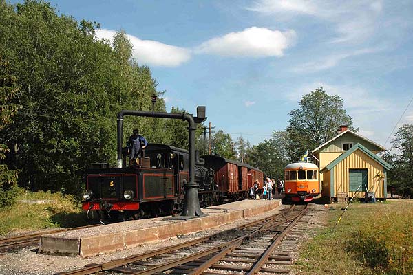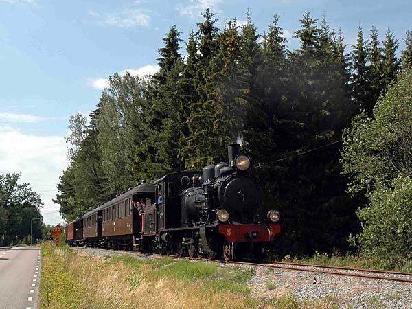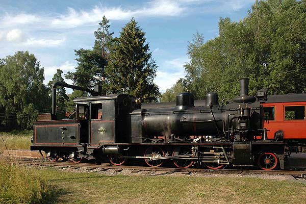 James Waite reports: The Uppsala–Länna Railway (ULJ) incorporates the oldest part of the Stockholm–Roslagens Järnvägar (“SRJ”), once a network of more than 300kms of railways of 891mm gauge (3 old Swedish feet) which served the Roslagen district to the northeast of Stockholm. The first part of this network, from the old university and cathedral city of Uppsala eastwards to Länna, opened in 1876. It was subsequently extended by way of junctions at Faringe and Rimbo until its lines reached the Baltic coast at Hargshamn, Hallstavik and Norrtälje as well as providing a suburban system closer to Stockholm, based upon the present Stockholm East station. The entire railway was nationalised in 1951 and amalgamated into the state SJ system in 1959. Closures began the following year and by the late 1970’s the whole network had been abandoned apart from the lines close to Stockholm which today form a busy electrified 65-km commuter system and are the only narrow gauge lines still in commercial use in Sweden. After closure the line from Uppsala as far east as Faringe was purchased by the Uppsala city council and with their help has been operated by enthusiasts as the ULJ since 1977. The line is nicknamed the “Länna-Katten” or Länna Cat, supposedly from its early days when it ran a small steam railcar that hissed and wheezed as it went! The preserved line is 32 km long. At first it runs through the eastern suburbs of Uppsala and then enters a stretch of rolling countryside. For most of the distance between Marielund, where many trains are timetabled to cross, and Almunge the line runs alongside a series of three lakes, very pretty locations which are popular holiday and weekend destinations with excellent bathing facilities. Between Almunge and Faringe the line passes through a forest. The loco shed and main depot are at Faringe, a somewhat lonely spot today, although in the system´s heyday, from 1921 to 1950, it was a busy junction station, connecting the northern branches of the narrow gauge network with the capital. Much of the stock was locked away when I called at Faringe. Anyone wanting to see it would do well to try to arrange this is advance. The ULJ operates during weekends in the summer months and can be easily reached via regular trains from Stockholm to Uppsala. The line terminates alongside the SJ station at Uppsala though for the past couple of years the area has been undergoing major rebuilding and ULJ trains have been operating from a temporary station some distance to the southeast. The next series of pictures show 5 (see below) at work: Taking water at Marielund with the 15.42 train from Almunge to Uppsala. A 1955 vintage SJ diesel railcar on the right forms the 15.40 train from Uppsala to Faringe. There are similar railcars at many of Sweden's preserved 891mm gauge railways. At Marielund station with the 17.05 train from Uppsala to Almunge. Approaching Almunge with the 13.30 train from Uppsala. No. 4 “Långshyttan” This 0-6-0T came to the ULJ from the Byvalla–Långshyttan Railway, an 891 mm gauge line about 80 km to the west of Gävle, where it ran under the same name and number. The BLJ closed in 1964 but internal shunting with steam at the Långshyttan ironworks continued until 1971. “Långshyttan” was built by Motala in 1897 and reboilered in the 1950s. Several of the BLJ´s many locos have been preserved on the steam railways of Sweden. No. 4 has a steam brake and weighs about 15 tons in working order This engine has not been fitted with an air brake system and is used for hauling the line’s “vintage train”, mainly consisting of hand braked four-wheeled vehicles. No. 5 “Thor” This 2-8-0 was built at Falun for the BLJ in 1909 and came to the ULJ in 1974. Five engines of this design were built by Falun, including one for the SRJ network, but “Thor” is the only survivor. Has the typical Swedish turbine spark arrester, like no. 4, and retains its original saturated boiler with 12 bar pressure. In regular use on its home line until 1964. Weight in working order about 40 tons including tender. Air brake equipment fitted upon arrival at the ULJ. No. 16 A superheated 2-8-0T built by Nohab in 1916 for the North Östergötland Railway; ran with SJ markings 1950-60, then sold to the short Hå–Vallvik pulpwood line north of Gävle. Bought by the society in 1970. Currently being restored to working order. Weight in working order about 36 tons. No. 28 An attractive superheated 2-6-2, one of three built new for the SRJ by Henschel in 1920. Sweden´s heaviest narrow gauge steam engine with a weight in working order of 62 tons. An impressive machine with driving wheels of 1300 mm diameter and once the racehorse of the Roslagen network. The only ex-SRJ engine saved by the SJ after steam disappeared from the Roslagen network in about 1960-62. Operated by the ULJ between 1987 and 2004. Currently stored out of use at Faringe awaiting overhaul. No. 3132 A superheated 2-8-0 built new for the SJ narrow gauge lines in 1950. Worked the brunt of ULJ’s summer trains until 1978, when “Thor” took over. Weight in working order about 50 tons. Some 15 engines of this type were built in Sweden for both 891 mm and 1067 mm (3´6”) lines between 1916 and 1950. Currently stored awaiting restoration. No. 11 A superheated, oil-fired 2-8-2T built in 1947 for a 802mm gauge line. Partly converted to 891mm gauge but stored for many years. My thanks to Kurt Moller, a volunteer at the 600mm gauge line at Mariefred, for his help in writing the greater part of these notes. |