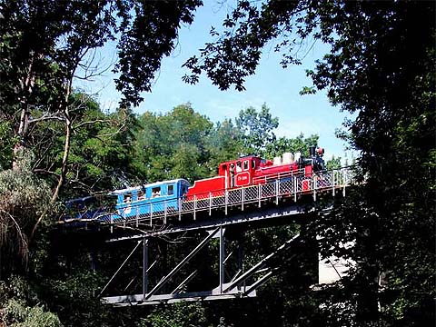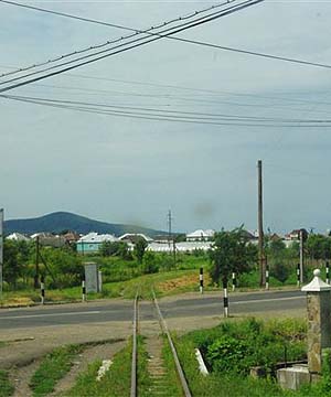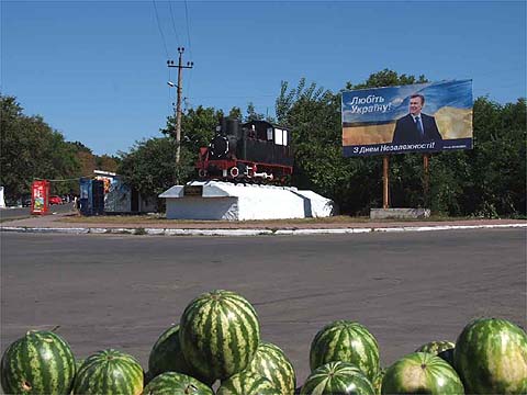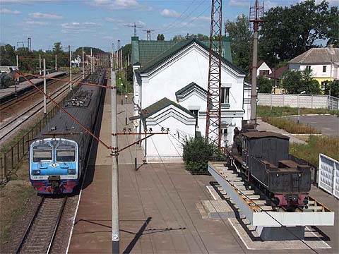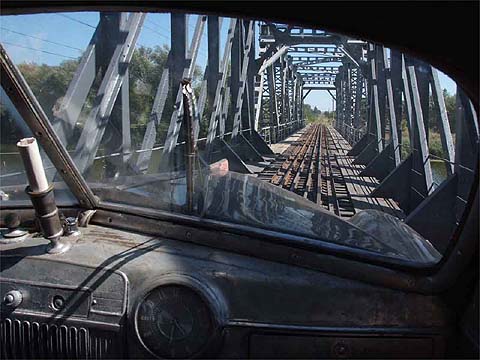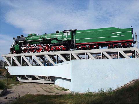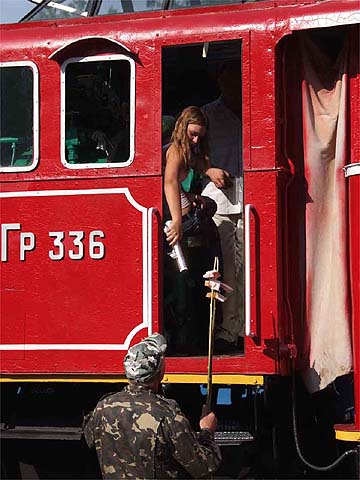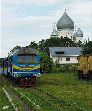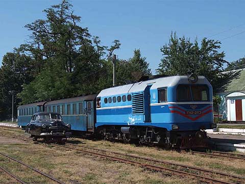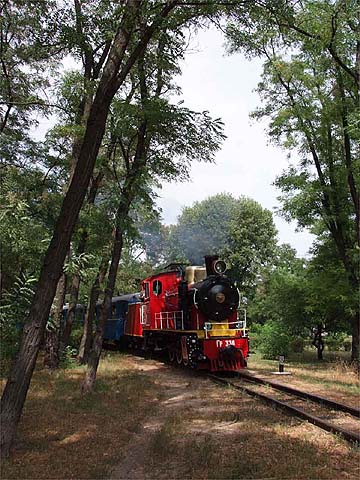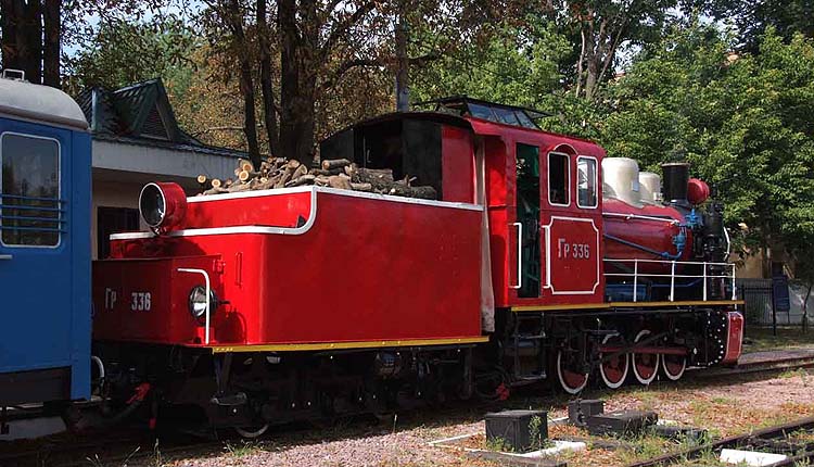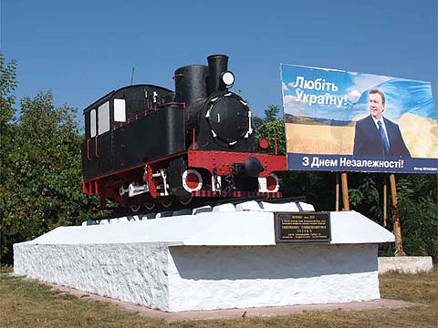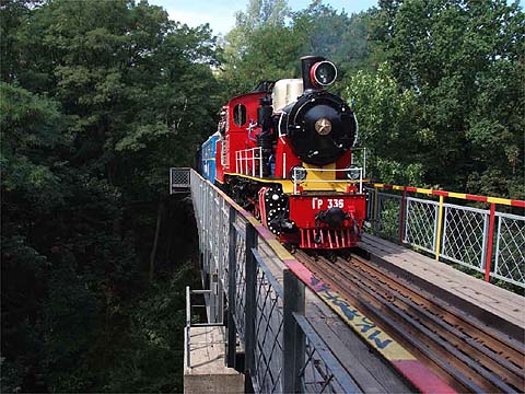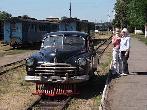 James Waite reports on a visit to Kiev or a few days in August 2010, he later returned to ride behind Gr 280 at Gaivoron, click here for some pictures of this visit on a separate page. This page also includes (at the bottom) some pictures of the Borsava narrow gauge railway and preserved Gr 6 286 nearby, click here to go there directly. There is a 157 class 0-8-0 preserved at Boyarka station in the southern outskirts of the city. These were built in the 1920's and early 1930's, the first Soviet narrow gauge design and those who know about these things there regard them as the most successful narrow gauge steam loco the country ever had. Strangely only a very few have been preserved and this is one of two in Ukraine. On the Monday we made a very long day trip to Gaivoron, about 200 miles or so south of Kiev. It's the centre of a narrow gauge system with two surviving lines running out of the city - only one train a day on the lines most days. There are four of the TU-2 diesels retained there to work them, all in very smart condition. Gaivoron has a railway works despite being quite a small town a long way from anywhere and in the Soviet days was the central repair shops for all the TU-2's which is maybe why they still use them in preference to the more modern diesels of which Ukraine has, or at least had, a surplus as other lines closed. They're kept in very smart condition. A ML class 0-8-0T which is the oldest surviving Soviet ng steam loco (built in the late 1800's) is now preserved on a plinth outside the main gate to the works. For most of its life it worked in Estonia until the Estonian narrow gauge was closed down in the early 1970's after which it moved to Gaivoron and spent its final operating years as the works shunter. It's the only surviving Estonian steam loco. The narrow gauge museum at Lavassare in Estonia would like to have it back but the Ukrainians won't part with it. There's a small market in the square where it lives and I took the first photo lying on my back in one of the stallholders' vans! The second one was taken later in the day when the sun had moved round to its other side. I wonder what the bigwig to the right (Ukraine's decidedly dodgy president) is saying about it! Here is what is thought to be the oldest surviving Russian ng coach, over 100 years old and now converted to use as a track geometry testing car. Our hosts Serguei and Vladimir had arranged a trip for us in a railcar converted from a 1950's ZIM limo, the type that the bigwig comrades used to roll around in in the 1950's. There seem to have been quite a number of these conversions but apparently this is the only one still in use anywhere in the former USSR. The two ladies awaiting their conveyance are young Yuliana, Vladimir's wife and Margaret, my wife. All six of us piled in and there was plenty of room - the comrades clearly didn't like to be cramped! We then set off backwards on a run of 25km to the next village of any size called Bershad. The car runs as fast backwards as forwards, somewhat disconcerting! On the way the line crosses the Southern Buh river on this large girder bridge where we had a photo stop. Bershad was very hot and sleepy. At the station we were greeted by the station lady who solemnly walked the length of the platform to change the signal for the return trip although it was many hours since the service train had passed through - and also greeted by two tired looking ponies standing outside the station with their carts. Surprisingly for a place with so little activity there was an ice cream stall in the station forecourt, very welcome! After 15 minutes or so we all piled back in for the return run where the car, if anything, seemed to go even faster! The 25km took about half an hour which must have involved an average speed of 50kph, not bad for the 750mm gauge, and not bad either considering the clunky noises and general complaining which the car produced whenever it was coaxed into action! The car, incidentally, was made at the GAZ car plant in Nizhny Novgorod which was close to our hotel there when we visited the children's railway last year. It's a truly enormous place which still employs more than 300,000 people. Back at Gaivoron we headed for the shed, home to the spare TU-2's and also to Gr 280 (LKM 15377/1950), one of the last ones still in working order though it seems only to be used for filming work now. It turned out that it had been so used the previous day and was still warm. The TU-2 which we'd just seen shunting in the station had just pushed it back into the shed when we arrived but the staff kindly pulled it out again for us. Apparently it's against the rules to leave it standing on its own without being coupled to a diesel and I suspect that the film work must involve a diesel loco pushing or pulling it along. After this it was time to set off on the long drive back to Kiev. Next day was Ukrainian Independence Day (which celebrates the country breaking away from the USSR) and a major public holiday. Gr 336 was in steam on the children's railway - definitely wearing an over-the-top paint scheme which would probably render Bernd Seiler speechless! Well, all the best domes in Kiev are golden so it would be unkind not to let Gr 336 join in the fun! Still I think I prefer the more modest attire of her sister at Gaivoron! The loco worked on the children's railway quite early on in her existence. She then moved on to one or more peat lines which have since closed and happily she was returned to the children's railway in 2005. She's only used two or three times a year and the railway has two TU-7 diesels for its everyday trains. As you'll see there's an impressive girder viaduct on the line. We moved on early afternoon for another tour of the city which took in amongst other things the broad gauge 0-6-0T which is preserved at the city's polytechnic university and the enormous green 2-8-4 outside the loco shed which, according to our guidebook, is the locomotive me